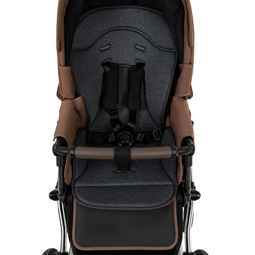 - Прогулочный блок имеет пятиточечные ремни безопасности и бампер-ограничитель с отделкой из экокожи. Бампер можно отсоединить с одной стороны и просто откинуть для удобства посадки ребенка.